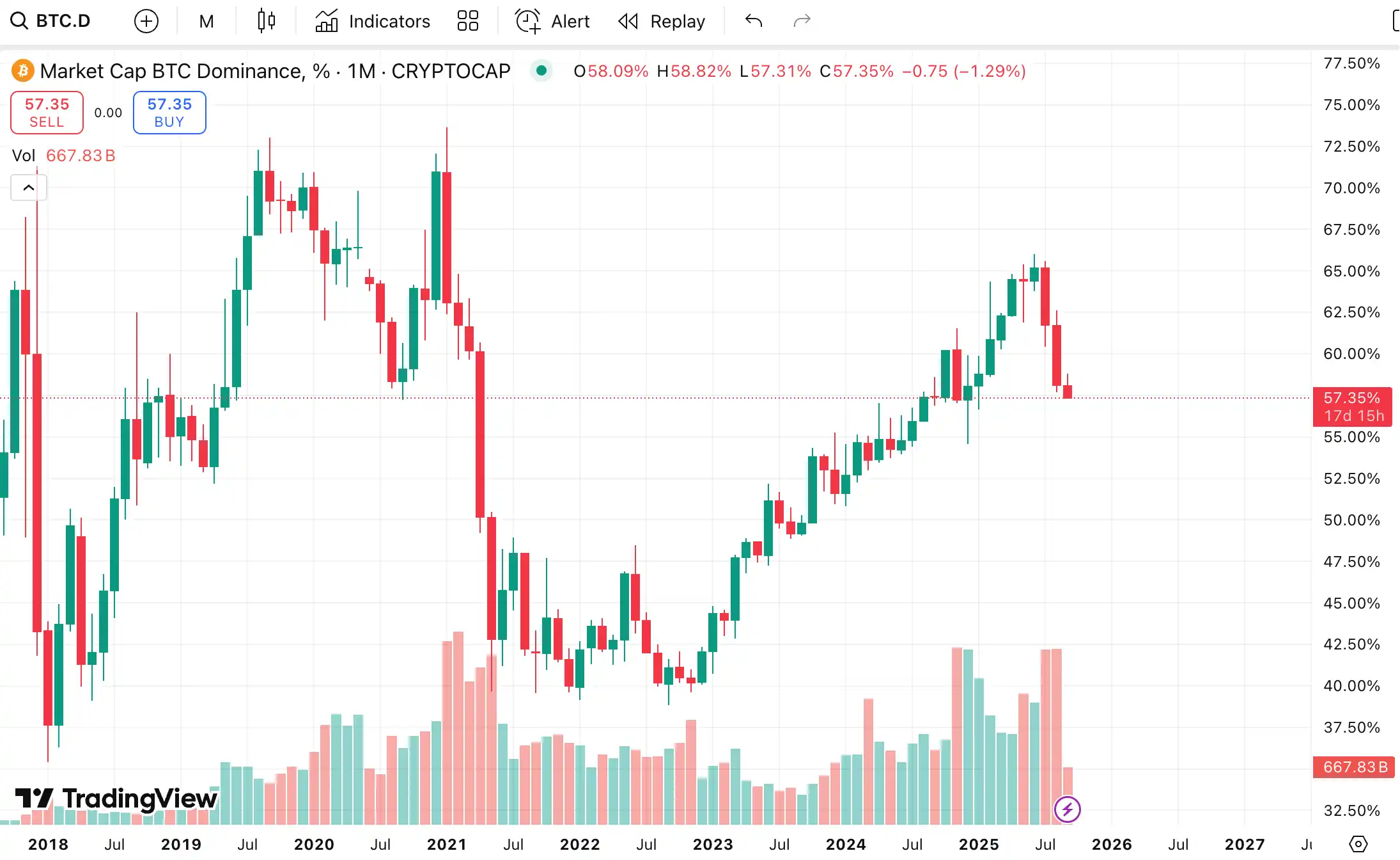 9 月 13 日,据行情数据,比特币市占率(BTC.D)目前降至 57.35%,